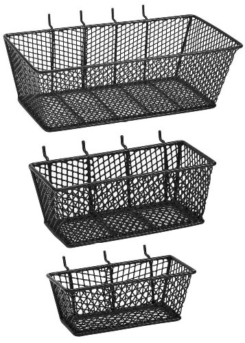 METAL MESH BASKET VALUE PACK - 1 each of small-medium and large metal baskets ~ Attaches to 1/4' pegboard ~ Use for a variety of tools and parts storage ~ Contains 1 each of 131592 & 131593 medium- ~ and large basket along with small basket ~ Small basket bottom dimensions: 5'L x 2-1/2'W ~ Top dimensions: 6'L x 3'W ~ Small basket 2-1/2' heightPeg Board Friendly BasketsWire/Mesh Construction for easy visability and durabilityAbility to hold large objects or a variety of smaller objects
