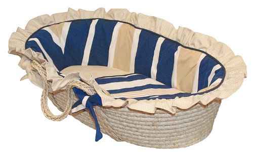 The Hoohobbers Moses basket made from sophisticated, designer fabrics. Great care is taken to create linens of the highest quality including doubled ruffles and ties plus detail piping. The unique, duvet style bumpers open to remove bumper padding for laundering. This allows the bumpers to always retain their crisp, original shape. The basket includes bumpers, sheet and a full size flannel-lined receiving blanket. Machine washable.