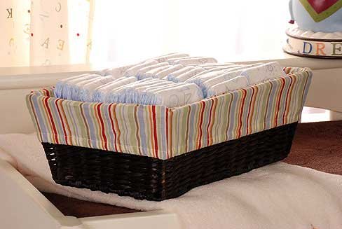 - The woven basket contains a fabric liner that fits snug in the basket with elastic binding